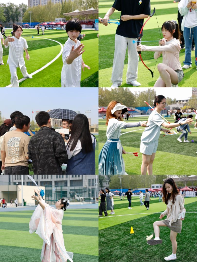 春意ON燃,乐享时光。学院通过举办古风运动会,融文化于体育,太极拳、抛绣球、投壶、踢花毽……一项项活色生香的古代运动从历史深处中走来,引导学生在运动中放松身心,增强体质,深度体验文化体育融合之美。运动会现场设有古文字辨认、趣味灯谜、洛书九宫格、印章文化展、传统曲艺、茶韵芳华、舌尖历史等互动区,感受中华文化的博大精深,体悟中华文明的源远流长。
