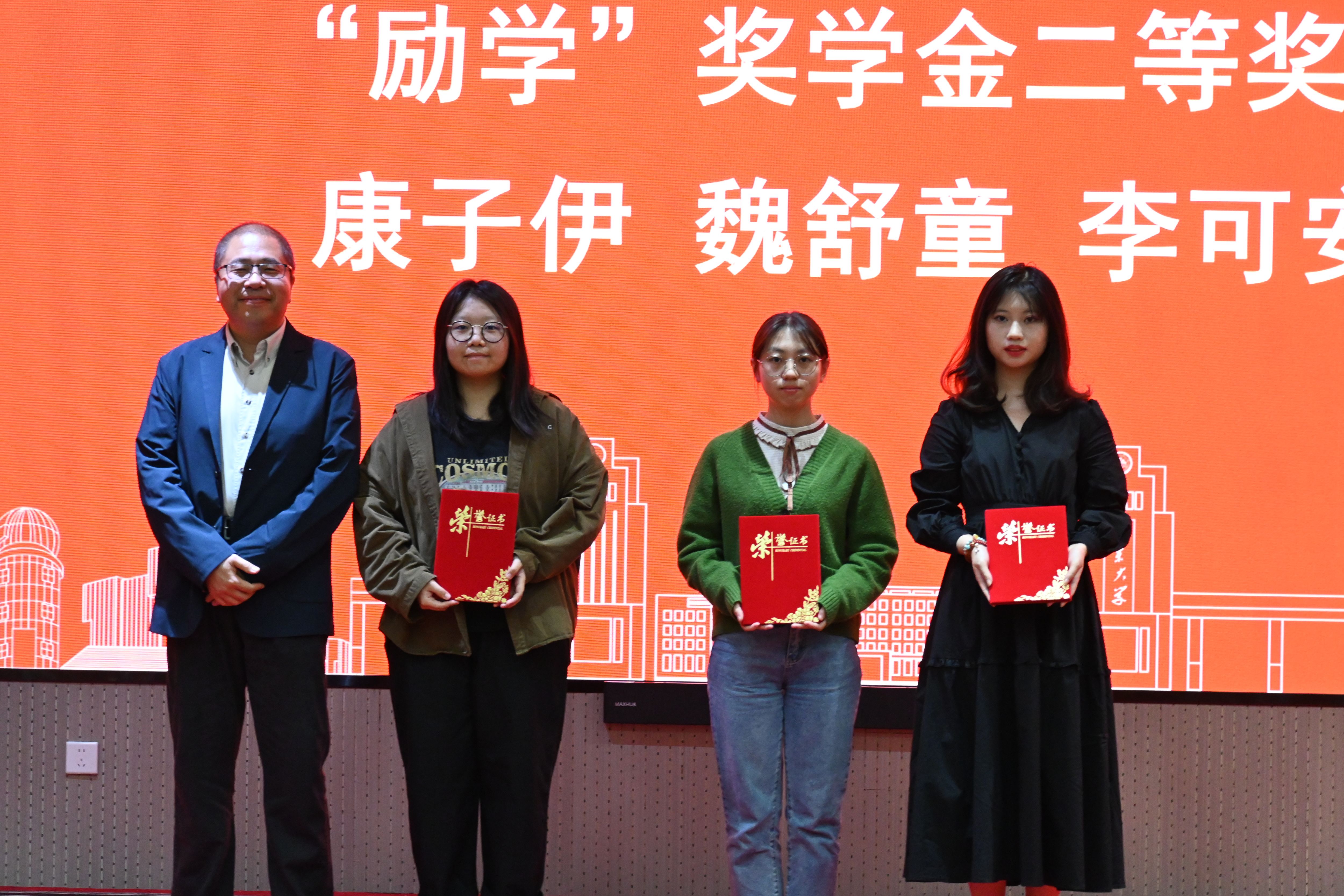 院长王芬、副院长唐仲明为“励学”奖学金获得者颁奖,并与获奖同学合影留念。