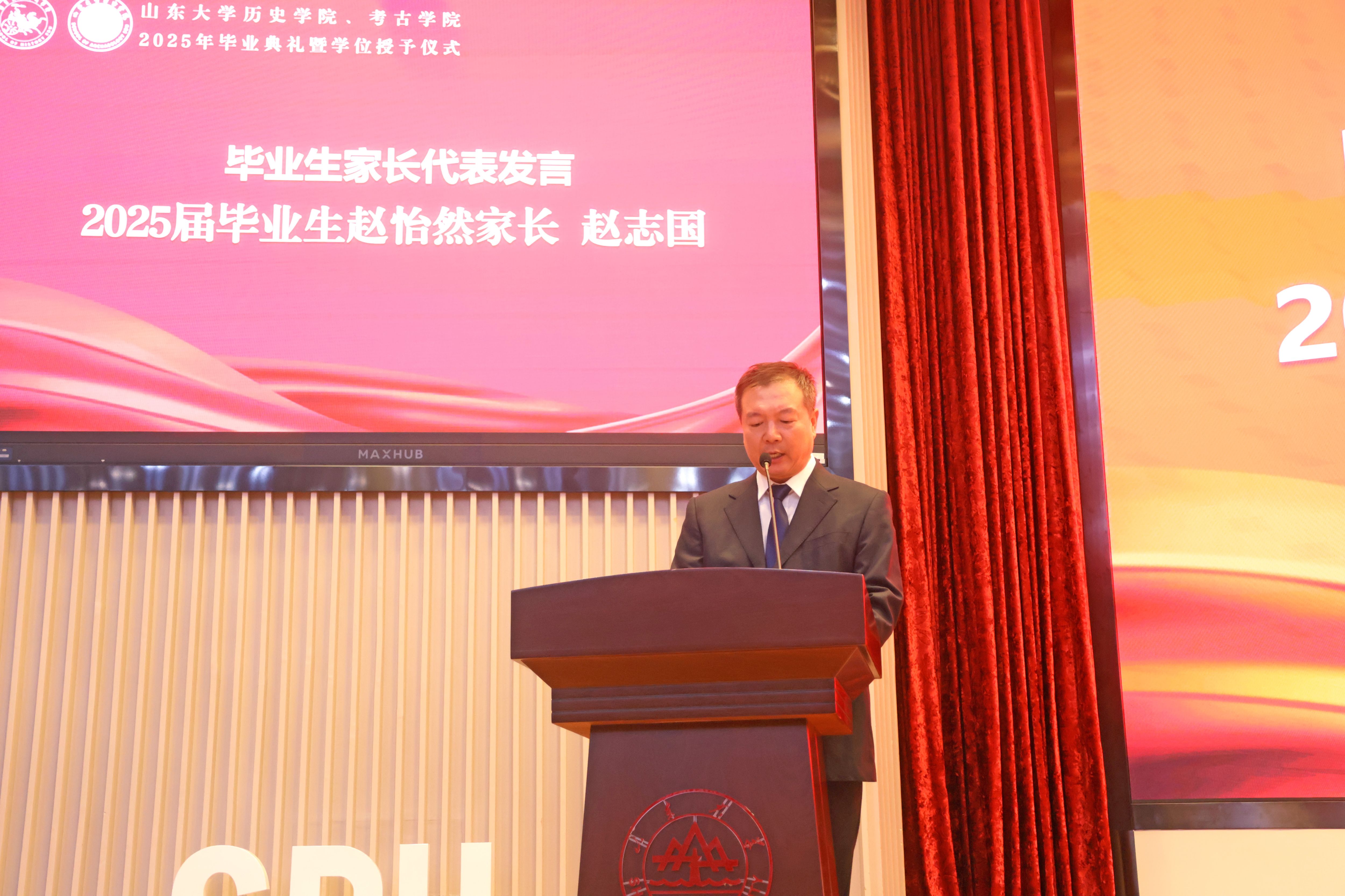 2022级考古学专业硕士研究生赵怡然家长赵志国作为毕业生家长代表,以“传承、成长、感恩”为关键词分享了家长们的心声。他感谢学院深厚的学术底蕴让孩子们触摸到了历史的温度、拥有了守护文明的精神底色,并代表家长们感谢偷情视频