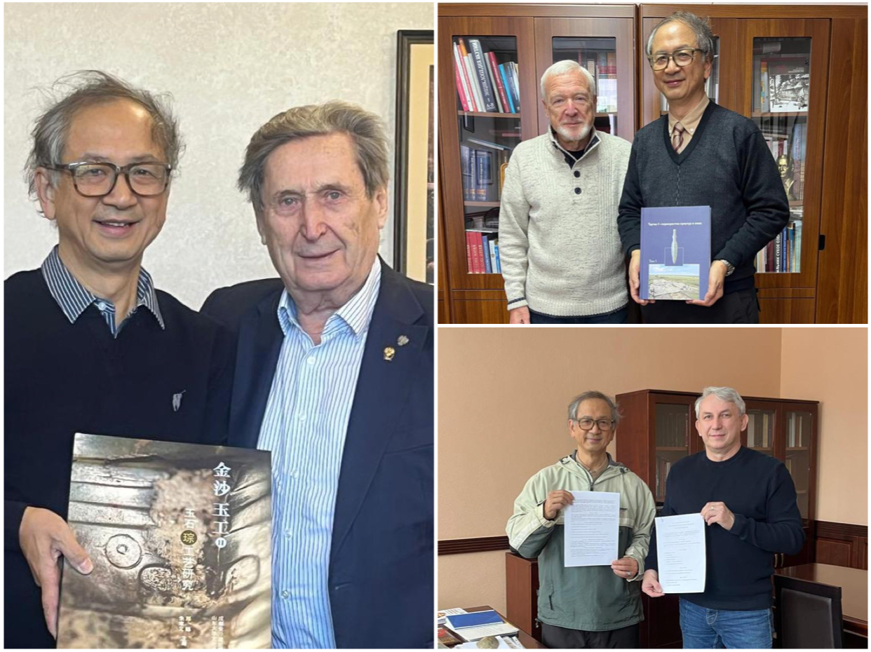 邓聪教授访问俄期间,与阿纳托利·杰列维扬科院士(左)、莫罗金·维亚切斯罗夫院士(右上)、安德烈·克里沃沙普金通讯院士(右下)交换出版物并拟定合作协议