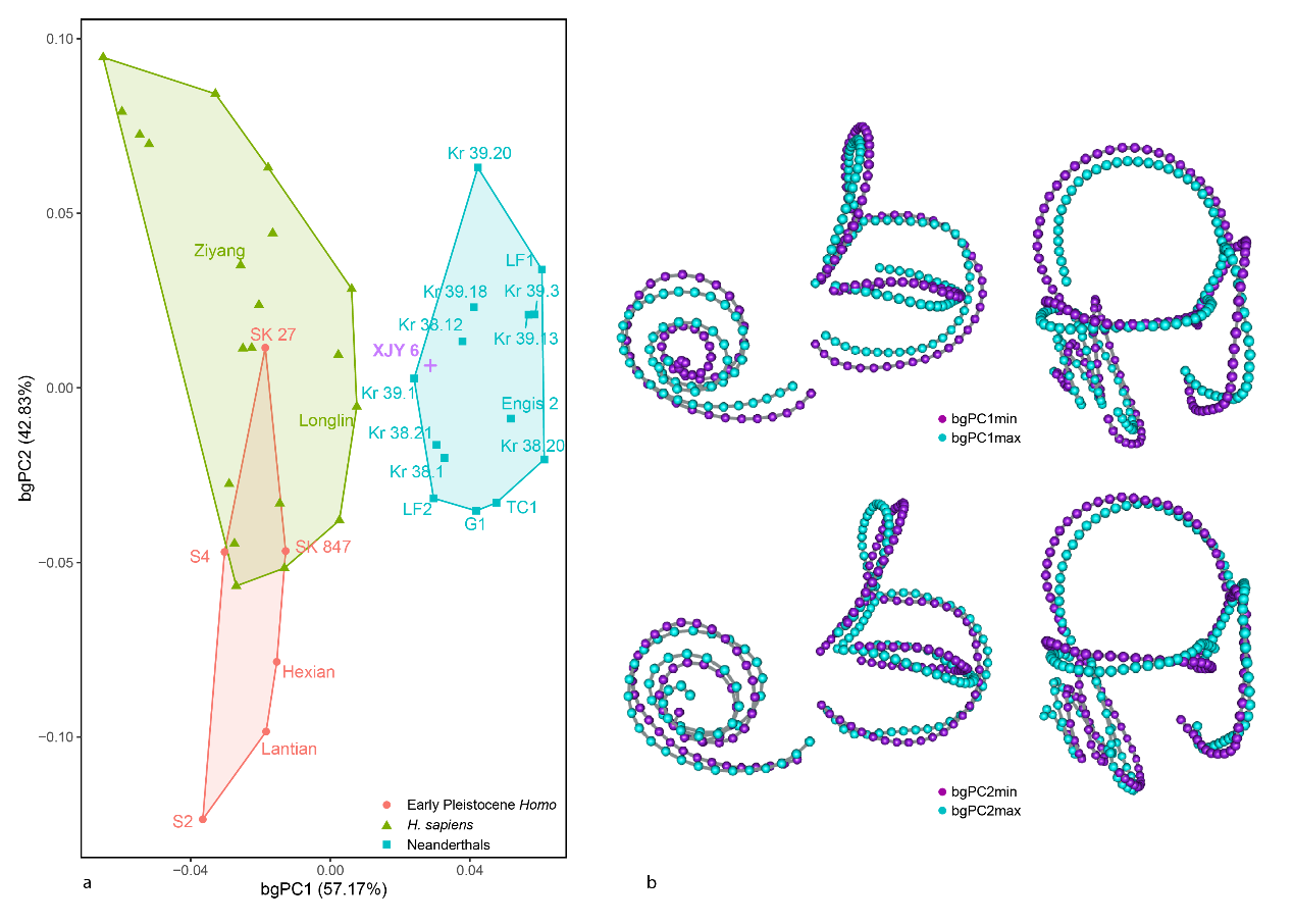 图 组间主成分分析显示许家窑人与尼人具有相似的内耳迷路特征