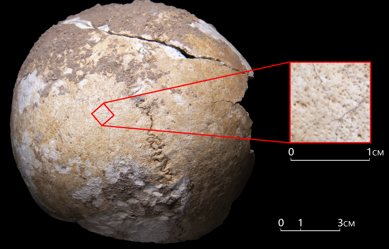 图二 下河洽东遗址M1个体顶骨和枕骨的多孔性骨肥厚(红色框表示放大1cm*1cm,有小孔愈合的迹象)