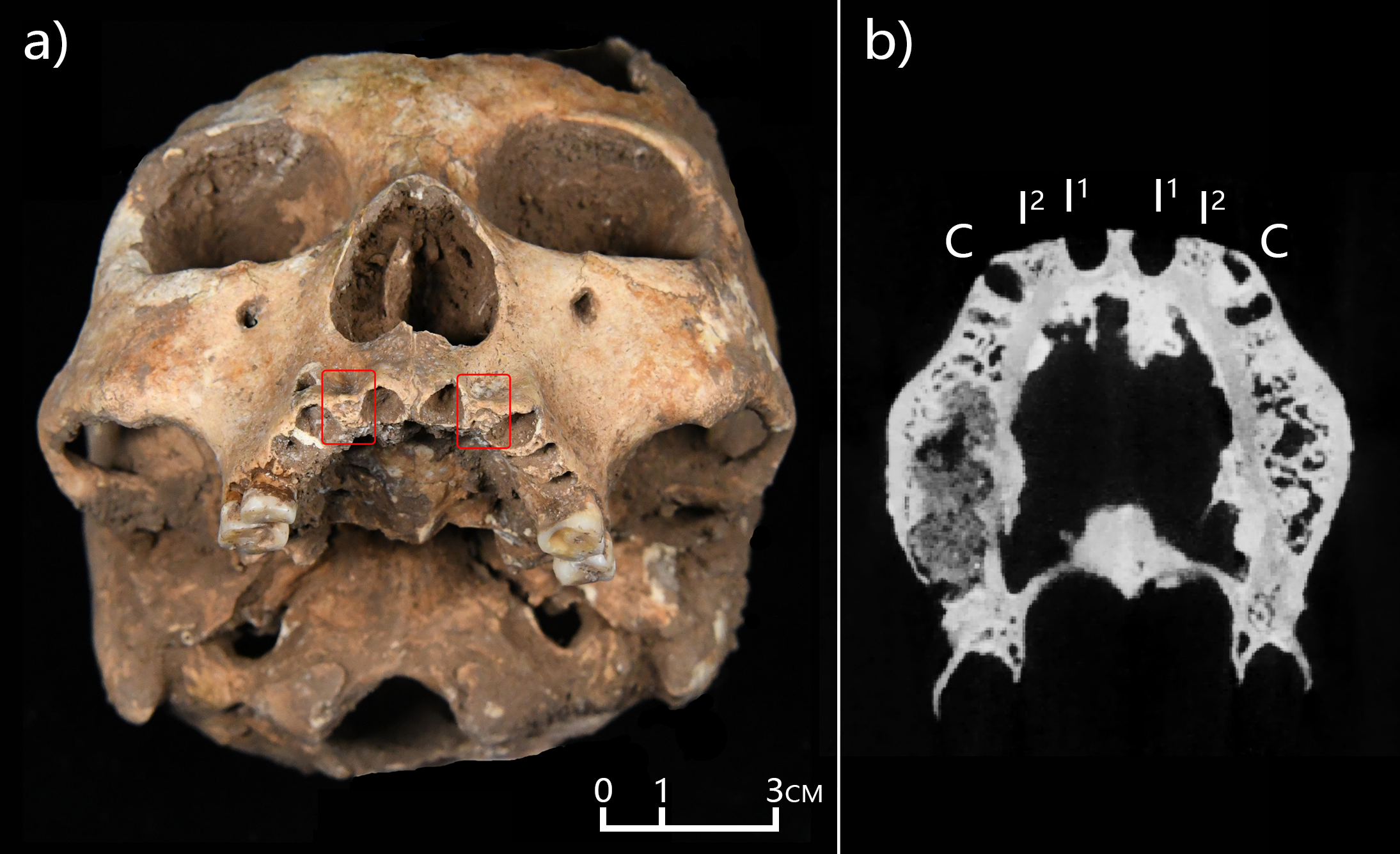 a.M2颅骨的人工拔牙;b.M2上颌CT扫描图像