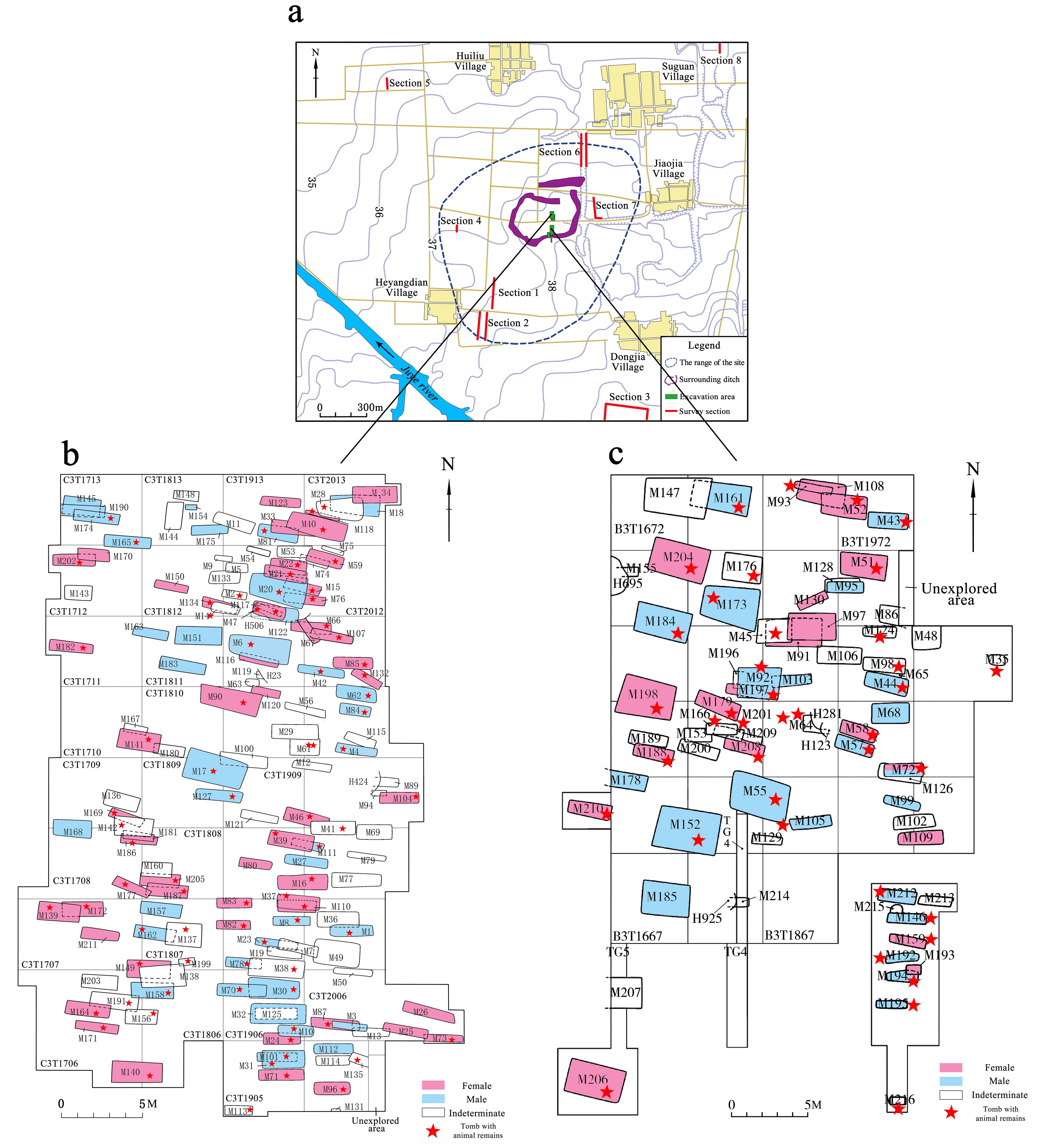 焦家遗址主要遗存属大汶口文化中晚期阶段,是鲁北古济水流域具有政治、经济和文化意义的大型中心聚落。该遗址发现了目前海岱地区年代最早的城址,入选“2017年全国十大考古新发现”。遗址发现的大型墓地布局清晰,墓葬种类多样且等级分化明显,随葬动物丰富。本研究依托焦家遗址2016-2017年度发掘的大汶口文化中晚期墓葬(图一),结合墓葬分期与等级、墓主性别与年龄等背景信息,考察了遗址大汶口文化墓葬内出土随葬动物的种类、部位和摆放位置等特征,从历时性演变的角度解析了先民将动物纳入丧葬实践的行为,并围绕随葬动物的性质与功能展开了具体讨论。