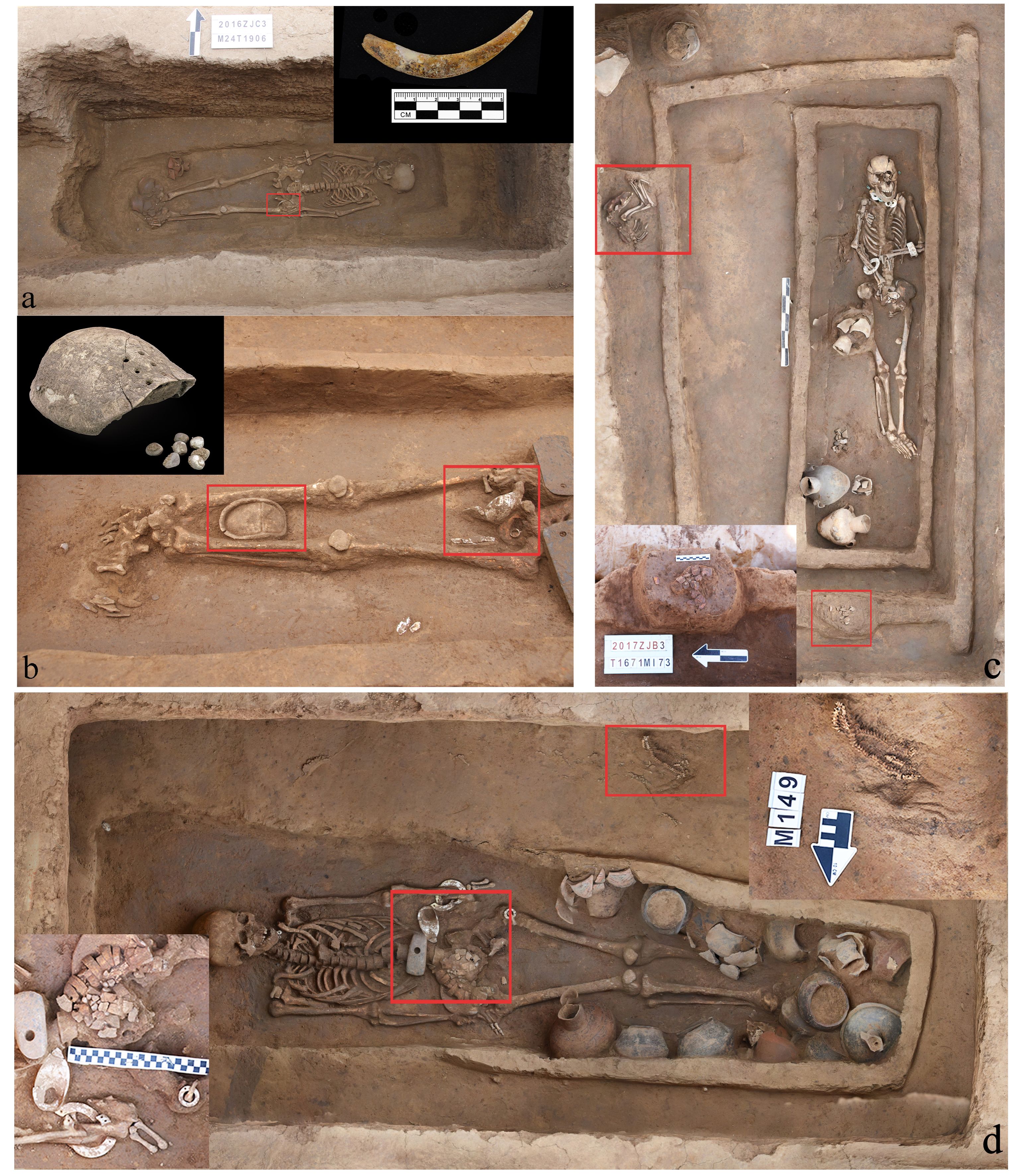 研究发现,在墓地使用的第二阶段,焦家先民就已形成了随葬多种动物的习俗,而后不断发展并逐渐稳定。焦家墓地出土随葬动物种属构成多样,尤其体现在先民对野生动物的选择上。其中,出现频率最高的是无齿蚌壳、獐牙和猪,反映了先民的选择偏好(图二)。特定种属与墓葬等级、墓主性别和社会身份等存在较强的关联性,獐牙、龟甲器等特殊制品的随葬凸显了其独特的社会和宗教意义(图三),为探索焦家精英群体所享受的丧葬待遇提供了重要线索。该研究作为一项重要的丧葬实践研究,为探索区域文明化进程中海岱地区的丧葬习俗、精神信仰及社会复杂化等问题提供了重要见解。