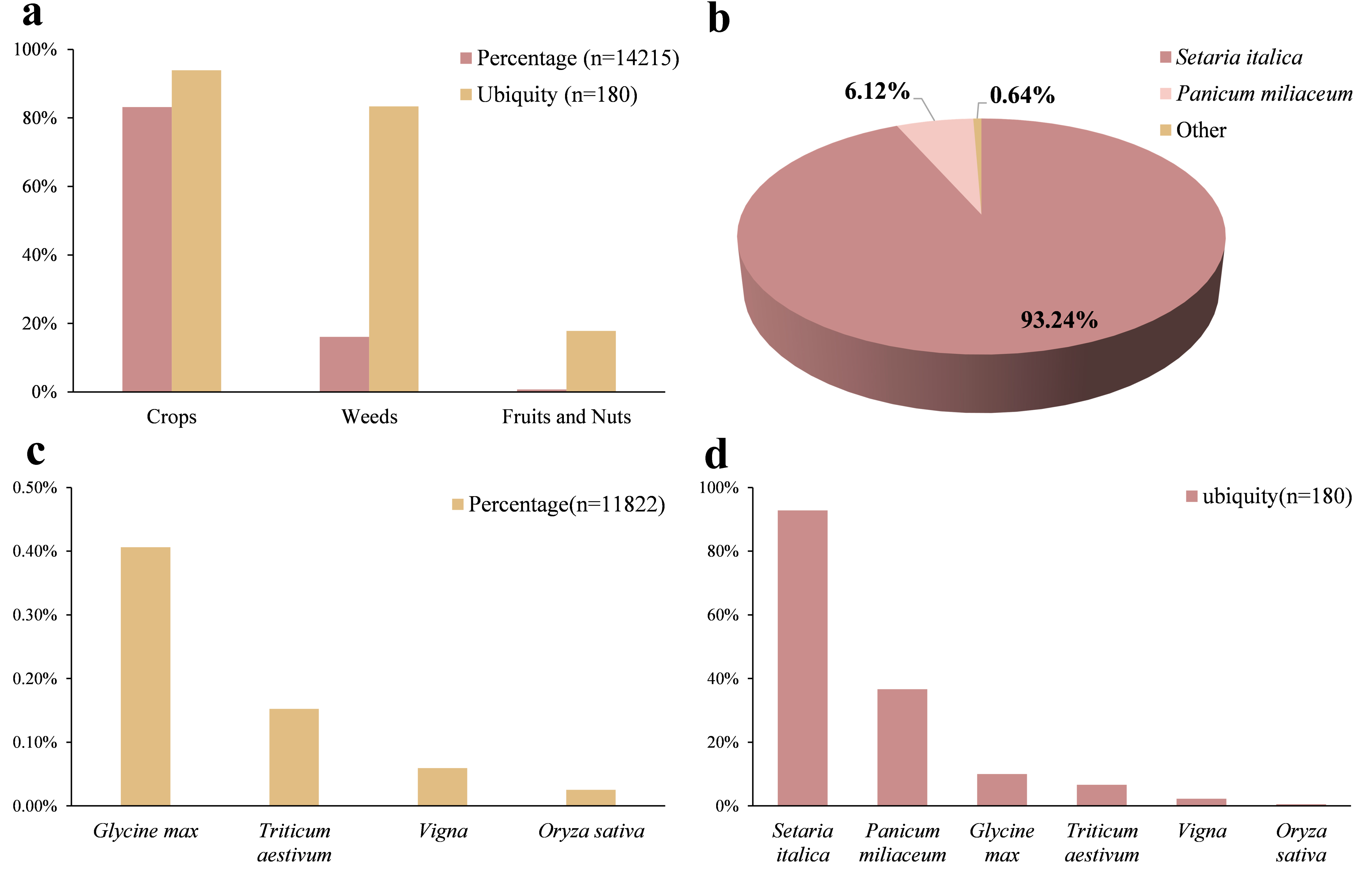 图二 城西新村遗址炭化植物遗存相对百分比与出土概率:a. 城西新村遗址炭化农作物、杂草、果实相对比例与出土概率;b. 粟、黍与其他农作物相对百分比; c. 除粟黍外其余农作物(大豆、小麦、豇豆属、水稻)相对百分比; d. 主要农作物出土概率
