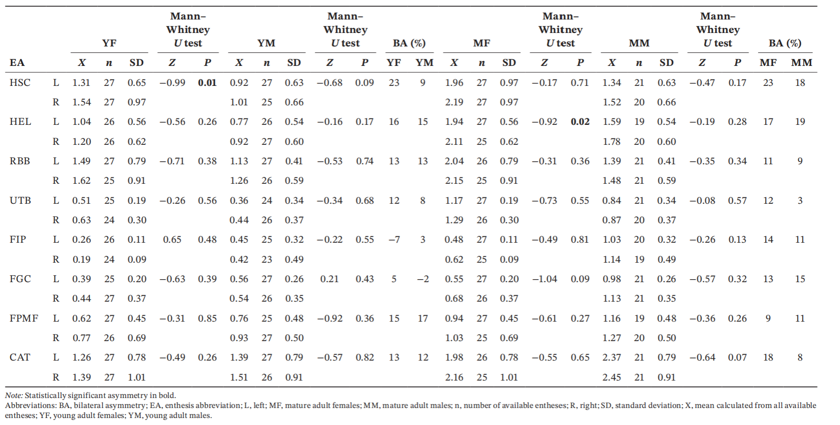 焦家遗址作为大汶口文化中晚期阶段的代表性遗址,位于鲁北古济水流域,是具有显著政治、经济和文化意义的大型中心聚落。该遗址不仅发现了海岱地区年代最早的城址,其发现更被选为“2017年全国十大考古新发现”之一,为探究中华文明的起源提供了重要的考古实证。起止点形态改变是人体长期使用肌肉的累积性变化,能够在一定程度上反映个体生前的行为模式,被认为是复原古代人群活动强度或日常习惯性行为动作的重要指标。本文对焦家遗址102例个体的8处纤维软骨型起止点的形态进行观测和分析,综合考虑墓葬等级、墓主性别及年龄等背景资料,重建遗址内部的劳动分工以及性别、墓葬等级之间的内在联系。