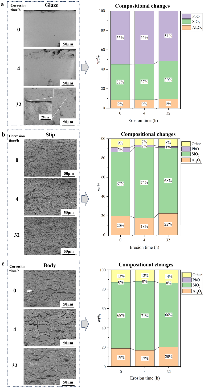 图一 碱腐蚀后瓷釉、化妆土、瓷胎显微形貌及主要成分变化图