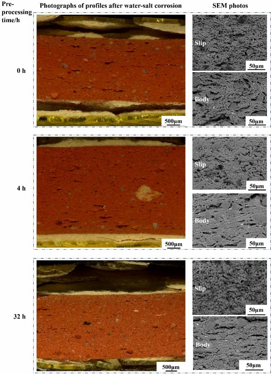 图二 耐盐实验后化妆土、瓷胎差异性腐蚀形貌图