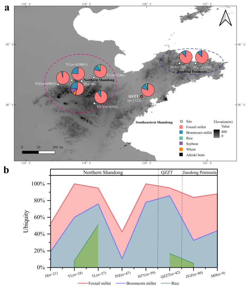 前冢子头遗址的植物考古证据显示,不同时期的作物组合呈现显著动态变化:大汶口晚期至龙山时期(距今约5000–4000年)为以粟为主导、水稻为补充的混合体系。岳石文化时期(距今约4000–3000年)转向以耐旱的粟黍为核心的旱作模式,并保留少量水稻的种植。周代(距今约3000–2200年)的作物组合则以粟为核心、逐步引入小麦且豆类种植稳定,完整呈现了过渡地带的农业适应轨迹。