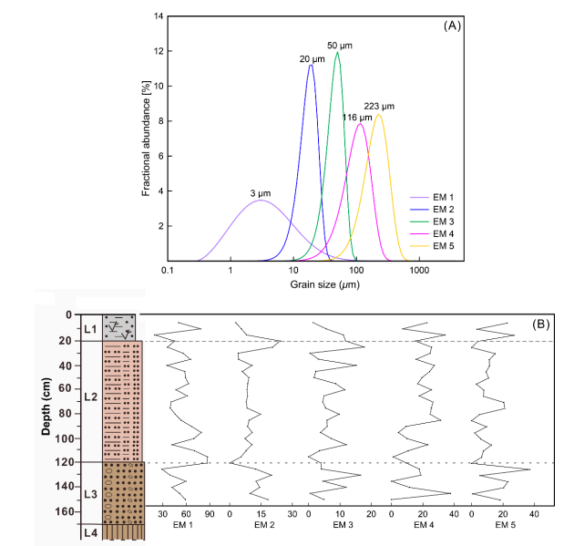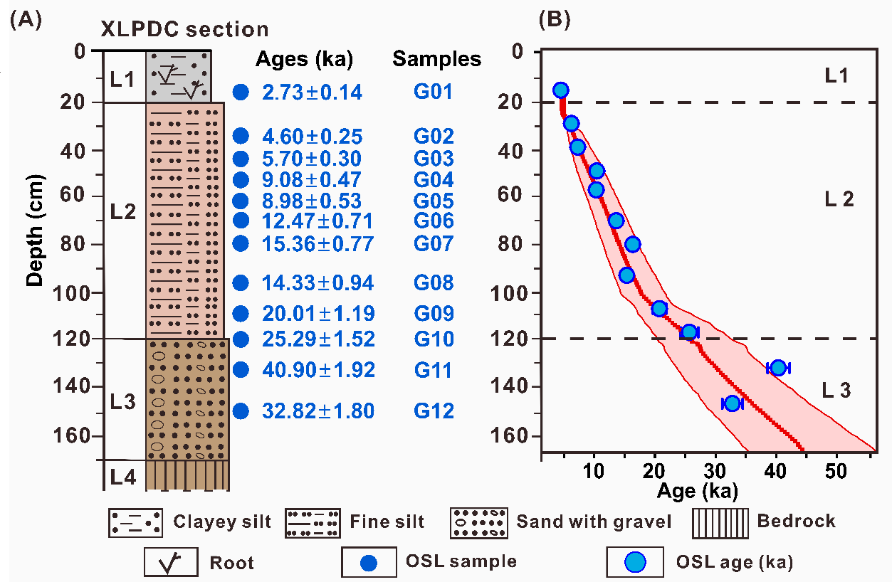 本研究以广西布兵盆地新立坡顶(XLPD)旧石器遗址为研究对象(图1B),通过对遗址出露的100厘米厚黄棕色砂质壤土开展系统的光释光测年、地球化学与粒度分析,首次在低纬度地区识别出风尘沉积并揭示其形成历史。光释光年代结果显示,该沉积序列形成于距今约2.5万年至2700年之间(图2),跨越末次盛冰期至晚全新世。地球化学特征指示其物源主要来自百色与布兵盆地周边的第四级阶地(图3)。粒度端元分析进一步表明,该沉积具有坡积-风成混合成因,包含原始风尘与次生再搬运组分(图4),是水力和风力共同作用的结果。