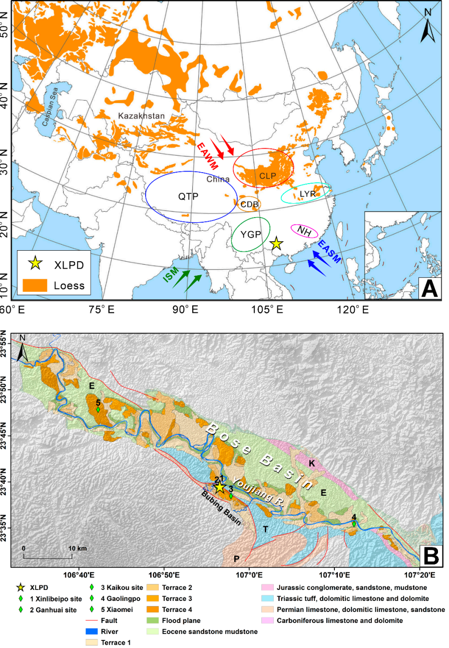 风尘沉积被认为是第四纪气候与环境变化的敏感指示载体。中国北方的连续黄土序列(图1A)已完整记录了自中新世以来的古气候与古环境演变历史。然而,在南方湿润的低纬度地区,此类沉积长期以来鲜有系统报道。