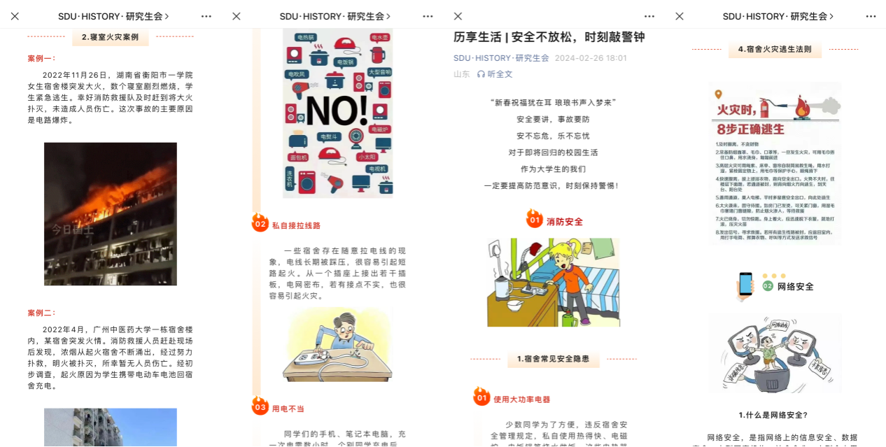 学院通过研究生会微信公众号发布“安全不放松,时刻敲警钟”主题推文,包含消防安全、网络安全、交通安全、食品安全等内容,配以相关案例和图片,提醒学生做好自身安全“第一责任人”,加强自我防范意识,提高安全保护能力,营造健康向上的新学期氛围。