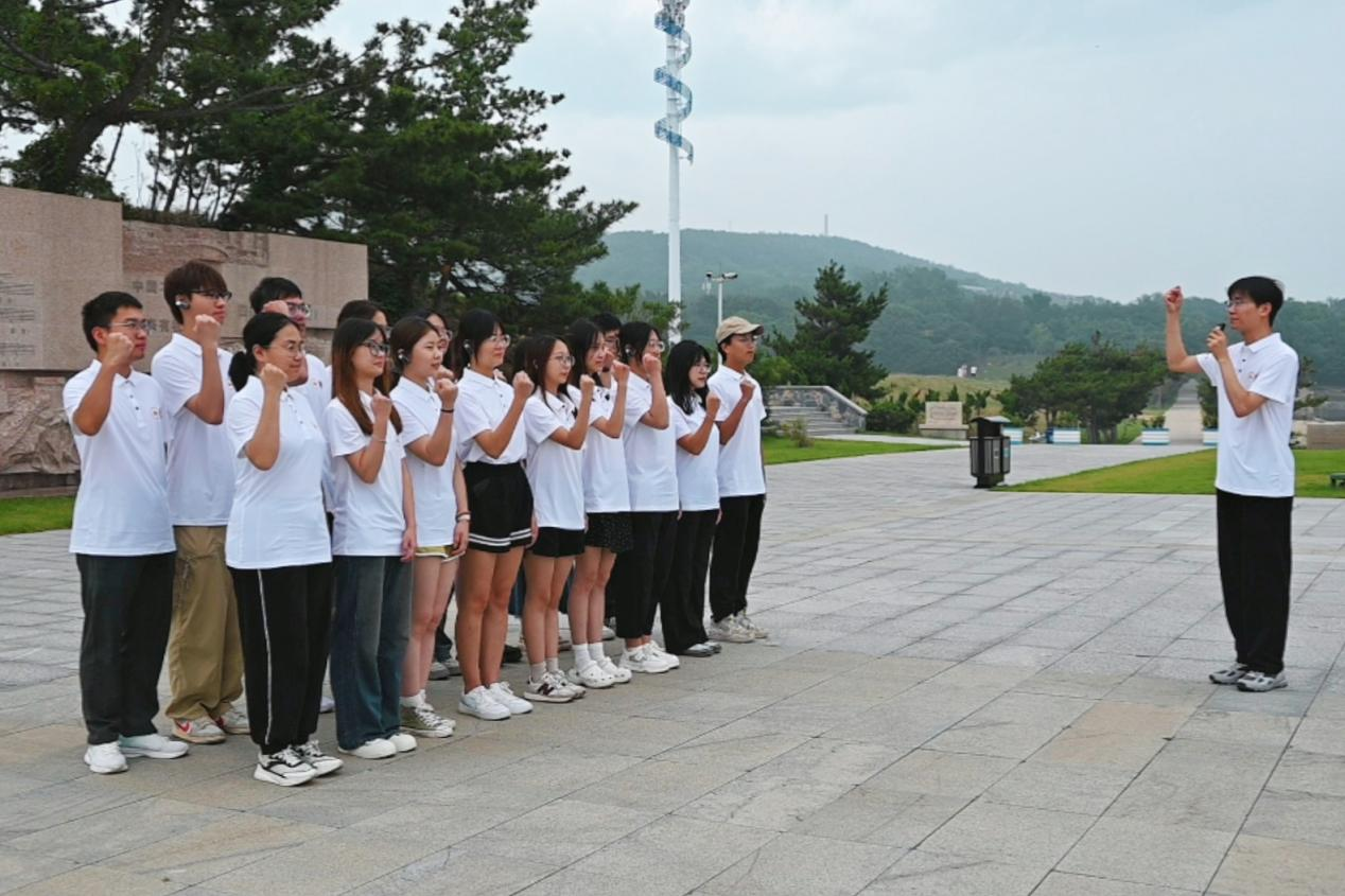 在东泓炮台、海军公所、黄岛炮台等历史遗迹现场,团队成员跟随讲解员的现场教学,进一步深化了对历史的思考和对先辈们奉献精神的无限景仰。在领队老师带领下,团队成员在“国帜三易”遗址对“历史三问”进行了庄严宣誓,在一句句振奋人心的话语中涌现出浓厚的爱国热情,增强了勇担民族复兴的使命感与责任感。