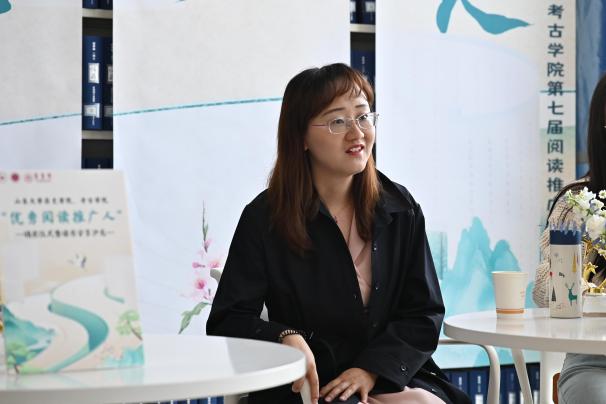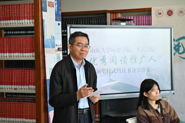 获得“优秀阅读推广人”荣誉称号的同学依次分享了自身阅读经历和感悟。2024级中国史专业硕士研究生王亦婷探讨了科技发展下的碎片化阅读与实体书存在的意义,认为实体书和图书馆具有不可替代的价值;2024级中国史专业硕士研究生王玉双介绍了学术读书“四步法”,强调要读出研究问题、逻辑结构、阅读方法论,并将其放在学术史中加以检验;2023级考古学专业本科生王英琪结合跨学科的阅读经历提出知识之间具有紧密联系,并呼吁各位同学广泛阅读书籍,以多元形式激发阅读兴趣。