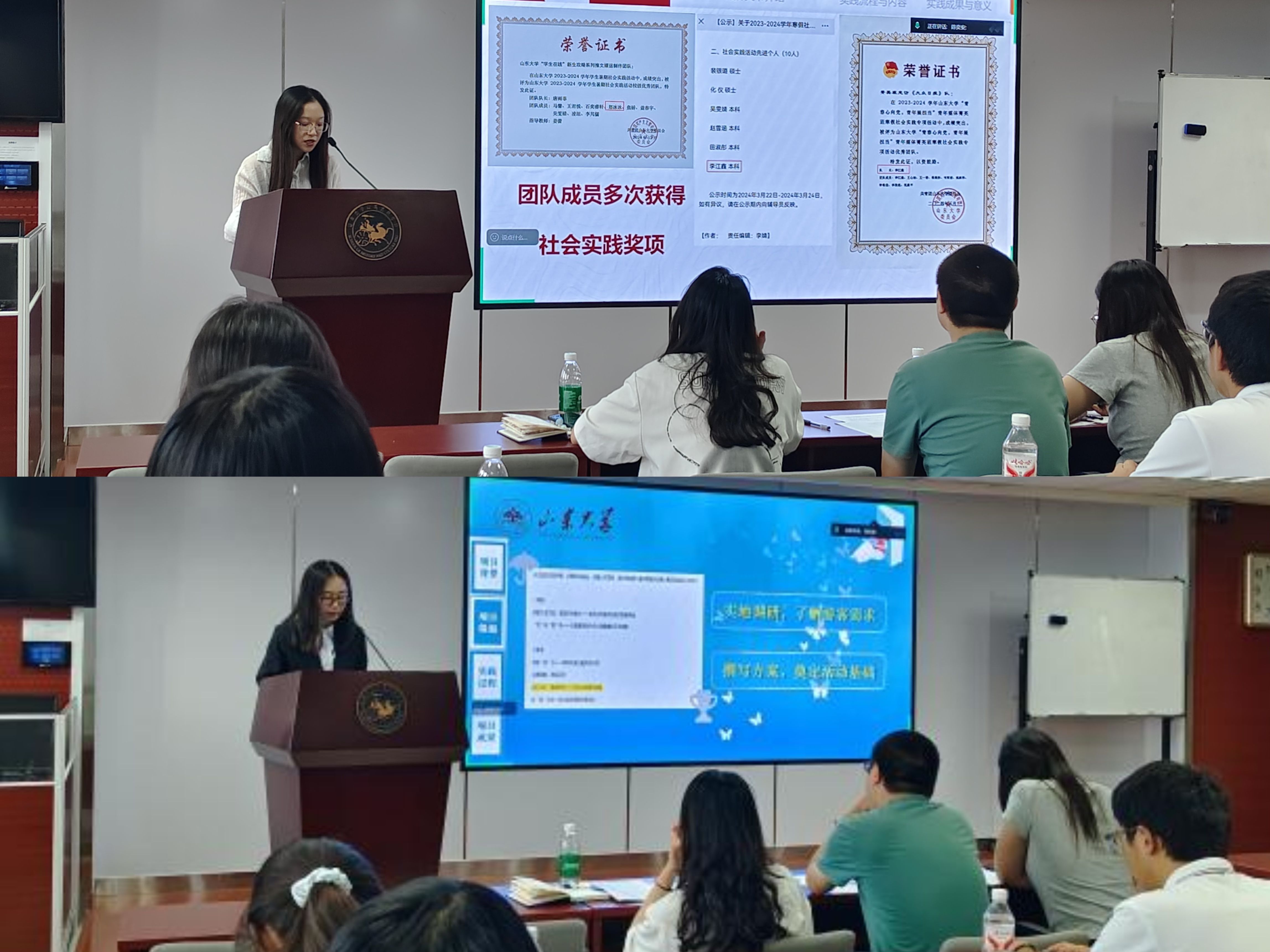 开展暑期社会实践答辩评比交流会,团委老师王兴兴、辅导员老师刘紫奕、刘子菁和班级团支书参加。