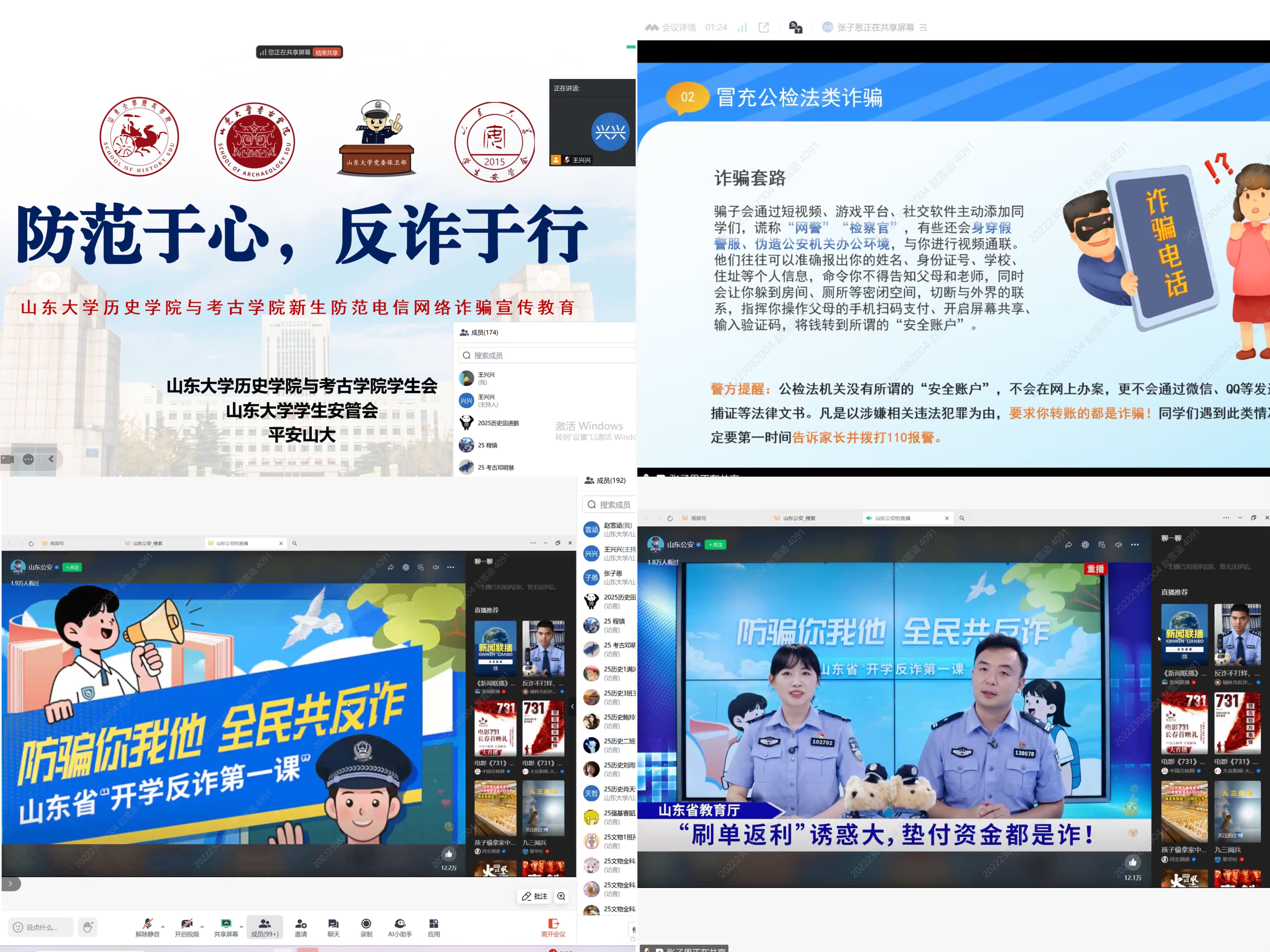 筑牢安全防线,共建平安校园。组织全体新生进行安全教育学习,集体观看“山东省开学反诈第一课”,联合学校公安处举办“防范于心,反诈于行”专题讲座,结合网络诈骗的真实案例进行深入剖析,引导新生树立“安全第—”的理念,增强安全意识,提升安全防范技能。