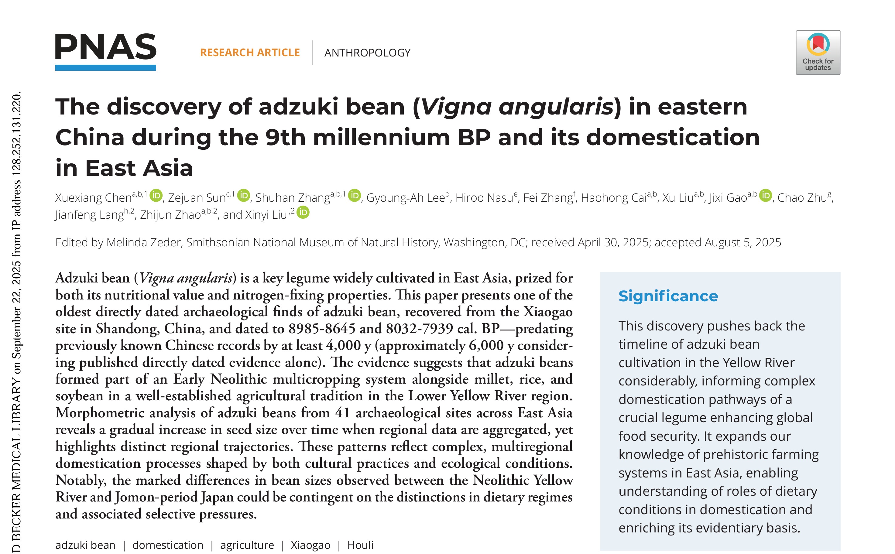 9月23日,偷情视频 与圣路易斯华盛顿大学、山东省文物考古研究院、安徽大学、俄勒冈大学、冈山理科大学、中国社会科学院考古研究所联合组成的国际团队,在《美国科学院院刊》(Proceedings of the National Academy of Sciences of the United States of America,PNAS)发表最新研究成果“The discovery of adzuki bean (V. angularis) in Eastern China during the 9th millennium BP and its domestication in East Asia”。团队通过植物考古和碳-14测年研究方法,在山东淄博后李文化小高遗址发现了距今9000年前的炭化小豆遗存,比此前中国境内发现的炭化小豆提早了4000年(比有直接测年数据的炭化小豆提前了6000年)。